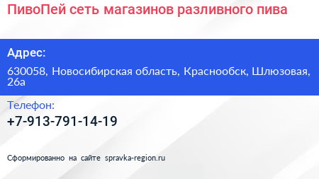 ПивоПей, сеть магазинов разливного пива по адресу 630058, Новосибирская область, Краснообск, Шлюзовая, 26а в дальнейшем Организация, размещена в следующих категориях:
