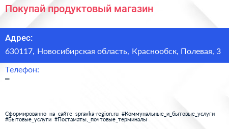 Покупай, продуктовый магазин по адресу 630117, Новосибирская область, Краснообск, Полевая, 3 в дальнейшем Организация, размещена в следующих категориях: