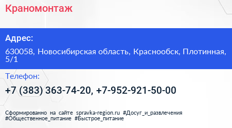 Краномонтаж по адресу 630058, Новосибирская область, Краснообск, Плотинная, 5/1 в дальнейшем Организация, размещена в следующих категориях: