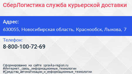 СберЛогистика, служба курьерской доставки по адресу 630055, Новосибирская область, Краснообск, Лыкова, 7 в дальнейшем Организация, размещена в следующих категориях:
