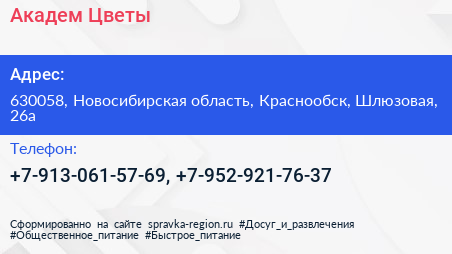 Академ Цветы по адресу 630058, Новосибирская область, Краснообск, Шлюзовая, 26а в дальнейшем Организация, размещена в следующих категориях: