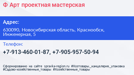 Ф-Арт, проектная мастерская по адресу 630090, Новосибирская область, Краснообск, Инженерная, 5 в дальнейшем Организация, размещена в следующих категориях: