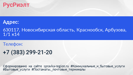 РусРиэлт по адресу 630117, Новосибирская область, Краснообск, Арбузова, 1/1 к14 в дальнейшем Организация, размещена в следующих категориях: