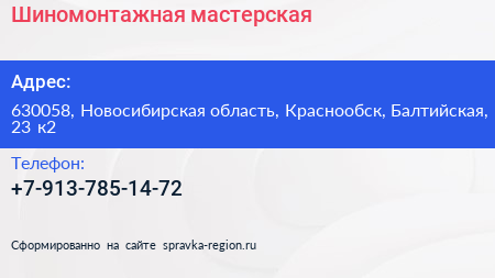 Шиномонтажная мастерская по адресу 630058, Новосибирская область, Краснообск, Балтийская, 23 к2 в дальнейшем Организация, размещена в следующих категориях: