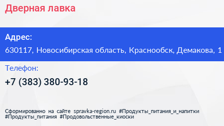 Дверная лавка по адресу 630117, Новосибирская область, Краснообск, Демакова, 1 в дальнейшем Организация, размещена в следующих категориях: