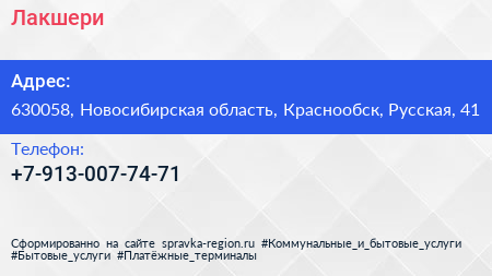 Лакшери по адресу 630058, Новосибирская область, Краснообск, Русская, 41 в дальнейшем Организация, размещена в следующих категориях: