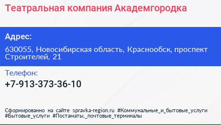 Театральная компания Академгородка по адресу 630055, Новосибирская область, Краснообск, проспект Строителей, 21 в дальнейшем Организация, размещена в следующих категориях: