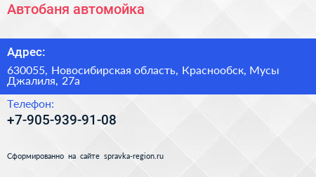 Автобаня, автомойка по адресу 630055, Новосибирская область, Краснообск, Мусы Джалиля, 27а в дальнейшем Организация, размещена в следующих категориях: