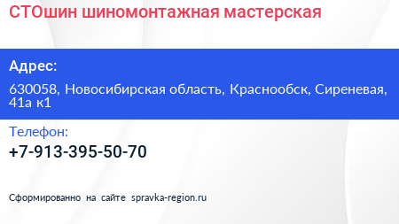 СТОшин, шиномонтажная мастерская по адресу 630058, Новосибирская область, Краснообск, Сиреневая, 41а к1 в дальнейшем Организация, размещена в следующих категориях: