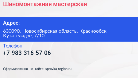 Шиномонтажная мастерская по адресу 630090, Новосибирская область, Краснообск, Кутателадзе, 7/10 в дальнейшем Организация, размещена в следующих категориях: