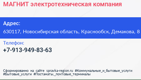 МАГНИТ, электротехническая компания по адресу 630117, Новосибирская область, Краснообск, Демакова, 8 в дальнейшем Организация, размещена в следующих категориях:
