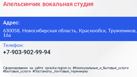 Апельсинчик, вокальная студия по адресу 630058, Новосибирская область, Краснообск, Тружеников, 16а в дальнейшем Организация, размещена в следующих категориях: