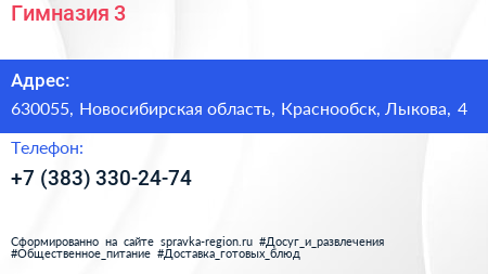 Гимназия №3 по адресу 630055, Новосибирская область, Краснообск, Лыкова, 4 в дальнейшем Организация, размещена в следующих категориях: