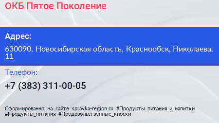ОКБ Пятое Поколение по адресу 630090, Новосибирская область, Краснообск, Николаева, 11 в дальнейшем Организация, размещена в следующих категориях: