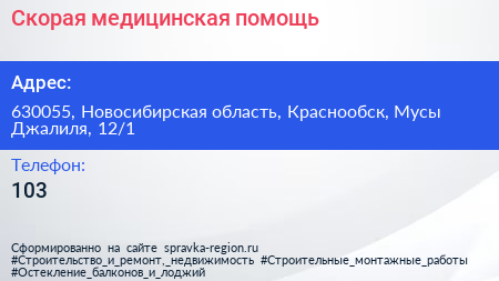 Скорая медицинская помощь по адресу 630055, Новосибирская область, Краснообск, Мусы Джалиля, 12/1 в дальнейшем Организация, размещена в следующих категориях: