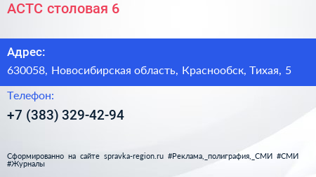 АСТС-столовая 6 по адресу 630058, Новосибирская область, Краснообск, Тихая, 5 в дальнейшем Организация, размещена в следующих категориях: