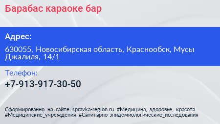 Барабас, караоке-бар по адресу 630055, Новосибирская область, Краснообск, Мусы Джалиля, 14/1 в дальнейшем Организация, размещена в следующих категориях: