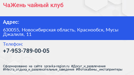 ЧаЖень, чайный клуб по адресу 630055, Новосибирская область, Краснообск, Мусы Джалиля, 11 в дальнейшем Организация, размещена в следующих категориях: