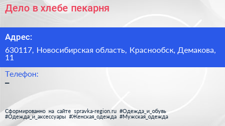 Дело в хлебе, пекарня по адресу 630117, Новосибирская область, Краснообск, Демакова, 11 в дальнейшем Организация, размещена в следующих категориях: