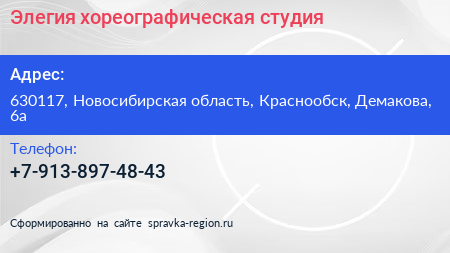 Элегия, хореографическая студия по адресу 630117, Новосибирская область, Краснообск, Демакова, 6а в дальнейшем Организация, размещена в следующих категориях: