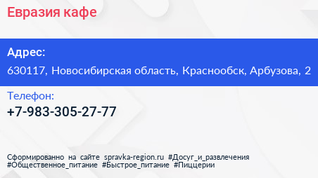 Евразия, кафе по адресу 630117, Новосибирская область, Краснообск, Арбузова, 2 в дальнейшем Организация, размещена в следующих категориях: