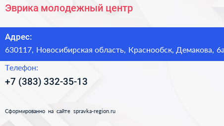 Эврика, молодежный центр по адресу 630117, Новосибирская область, Краснообск, Демакова, 6а в дальнейшем Организация, размещена в следующих категориях: