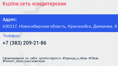 Kuzina, сеть кондитерских по адресу 630117, Новосибирская область, Краснообск, Демакова, 8 в дальнейшем Организация, размещена в следующих категориях: