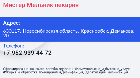 Мистер Мельник, пекарня по адресу 630117, Новосибирская область, Краснообск, Демакова, 20 в дальнейшем Организация, размещена в следующих категориях: