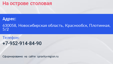 На острове, столовая по адресу 630058, Новосибирская область, Краснообск, Плотинная, 5/2 в дальнейшем Организация, размещена в следующих категориях: