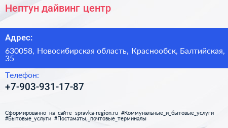 Нептун, дайвинг-центр по адресу 630058, Новосибирская область, Краснообск, Балтийская, 35 в дальнейшем Организация, размещена в следующих категориях: