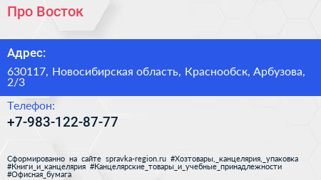 Про Восток по адресу 630117, Новосибирская область, Краснообск, Арбузова, 2/3 в дальнейшем Организация, размещена в следующих категориях: