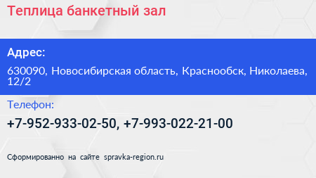 Теплица, банкетный зал по адресу 630090, Новосибирская область, Краснообск, Николаева, 12/2 в дальнейшем Организация, размещена в следующих категориях: