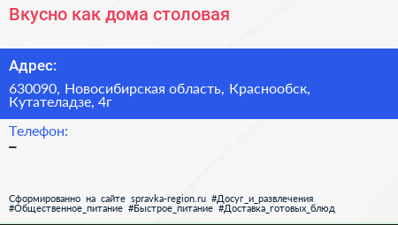Вкусно как дома, столовая по адресу 630090, Новосибирская область, Краснообск, Кутателадзе, 4г в дальнейшем Организация, размещена в следующих категориях: