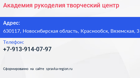 Академия рукоделия, творческий центр по адресу 630117, Новосибирская область, Краснообск, Вяземская, 3 в дальнейшем Организация, размещена в следующих категориях: