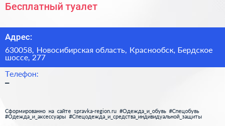 Бесплатный туалет по адресу 630058, Новосибирская область, Краснообск, Бердское шоссе, 277 в дальнейшем Организация, размещена в следующих категориях: