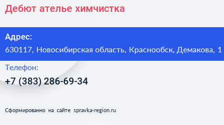 Дебют, ателье-химчистка по адресу 630117, Новосибирская область, Краснообск, Демакова, 1 в дальнейшем Организация, размещена в следующих категориях:
