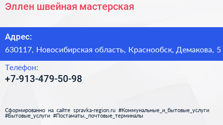 Эллен, швейная мастерская по адресу 630117, Новосибирская область, Краснообск, Демакова, 5 в дальнейшем Организация, размещена в следующих категориях: