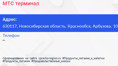 МТС, терминал по адресу 630117, Новосибирская область, Краснообск, Арбузова, 10 в дальнейшем Организация, размещена в следующих категориях: