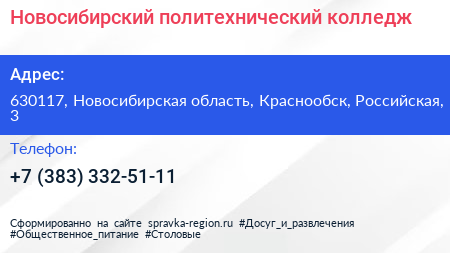 Новосибирский политехнический колледж по адресу 630117, Новосибирская область, Краснообск, Российская, 3 в дальнейшем Организация, размещена в следующих категориях: