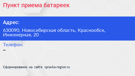 Пункт приема батареек по адресу 630090, Новосибирская область, Краснообск, Инженерная, 20 в дальнейшем Организация, размещена в следующих категориях: