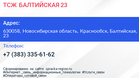ТСЖ БАЛТИЙСКАЯ, 23 по адресу 630058, Новосибирская область, Краснообск, Балтийская, 23 в дальнейшем Организация, размещена в следующих категориях: