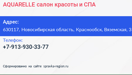 AQUARELLE, салон красоты и СПА по адресу 630117, Новосибирская область, Краснообск, Вяземская, 3 в дальнейшем Организация, размещена в следующих категориях: