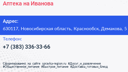 Аптека на Иванова по адресу 630117, Новосибирская область, Краснообск, Демакова, 5 в дальнейшем Организация, размещена в следующих категориях: