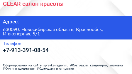 CLEAR, салон красоты по адресу 630090, Новосибирская область, Краснообск, Инженерная, 5/1 в дальнейшем Организация, размещена в следующих категориях: