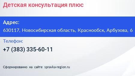 Детская консультация плюс по адресу 630117, Новосибирская область, Краснообск, Арбузова, 6 в дальнейшем Организация, размещена в следующих категориях: