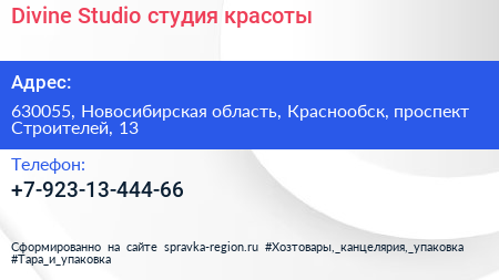 Divine Studio, студия красоты по адресу 630055, Новосибирская область, Краснообск, проспект Строителей, 13 в дальнейшем Организация, размещена в следующих категориях: