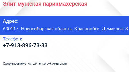 Элит, мужская парикмахерская по адресу 630117, Новосибирская область, Краснообск, Демакова, 8 в дальнейшем Организация, размещена в следующих категориях: