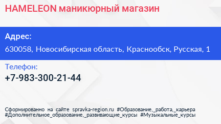HAMELEON, маникюрный магазин по адресу 630058, Новосибирская область, Краснообск, Русская, 1 в дальнейшем Организация, размещена в следующих категориях: