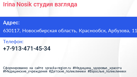 Irina Nosik, студия взгляда по адресу 630117, Новосибирская область, Краснообск, Арбузова, 11 в дальнейшем Организация, размещена в следующих категориях: