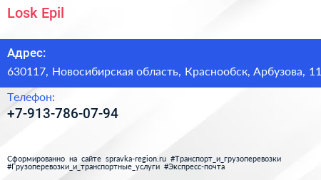 Losk Epil по адресу 630117, Новосибирская область, Краснообск, Арбузова, 11 в дальнейшем Организация, размещена в следующих категориях: